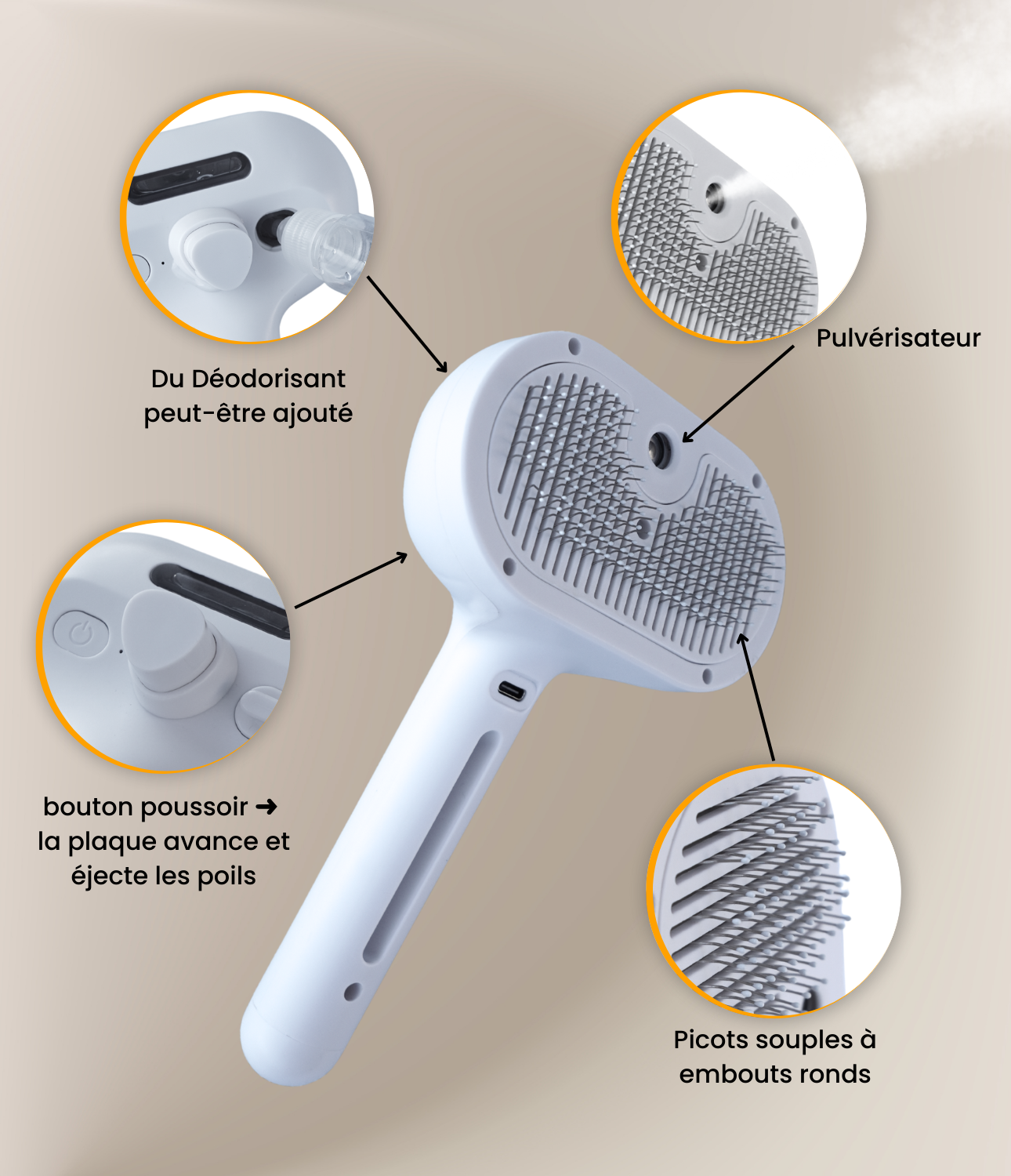 Brosse brumisante chien & chat 3-en-1 – éjection des poils (bouton poussoir)