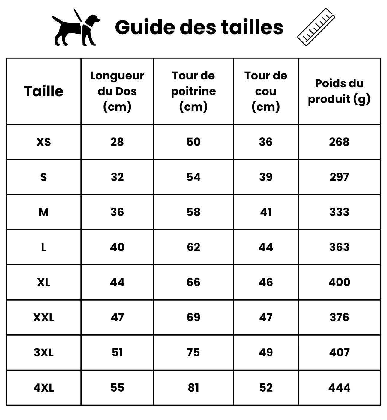 Conseil : mesurez le dos (base du cou → base de la queue) et les tours au plus large. Si votre chien est entre deux tailles, prenez la taille au-dessus.