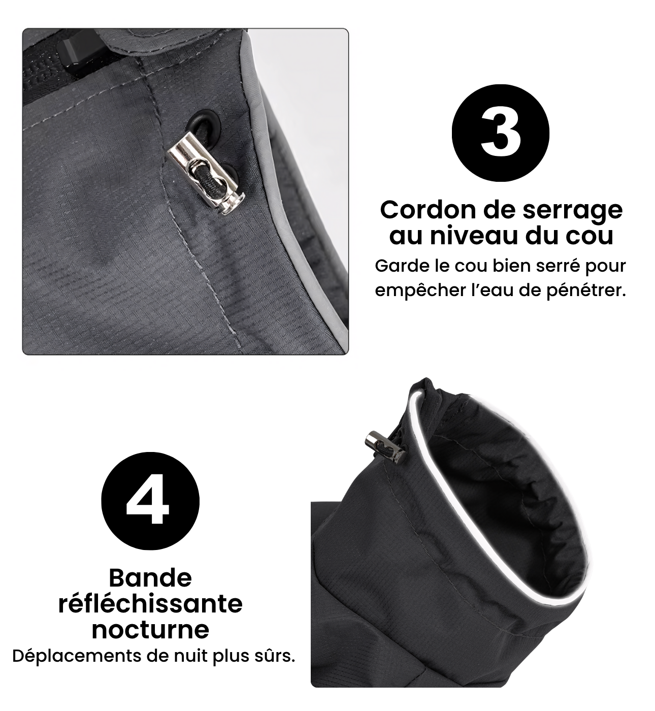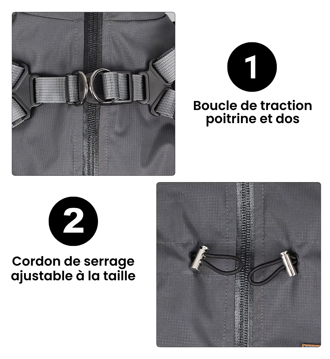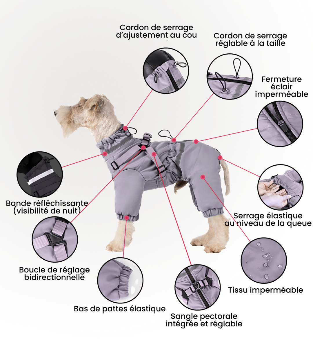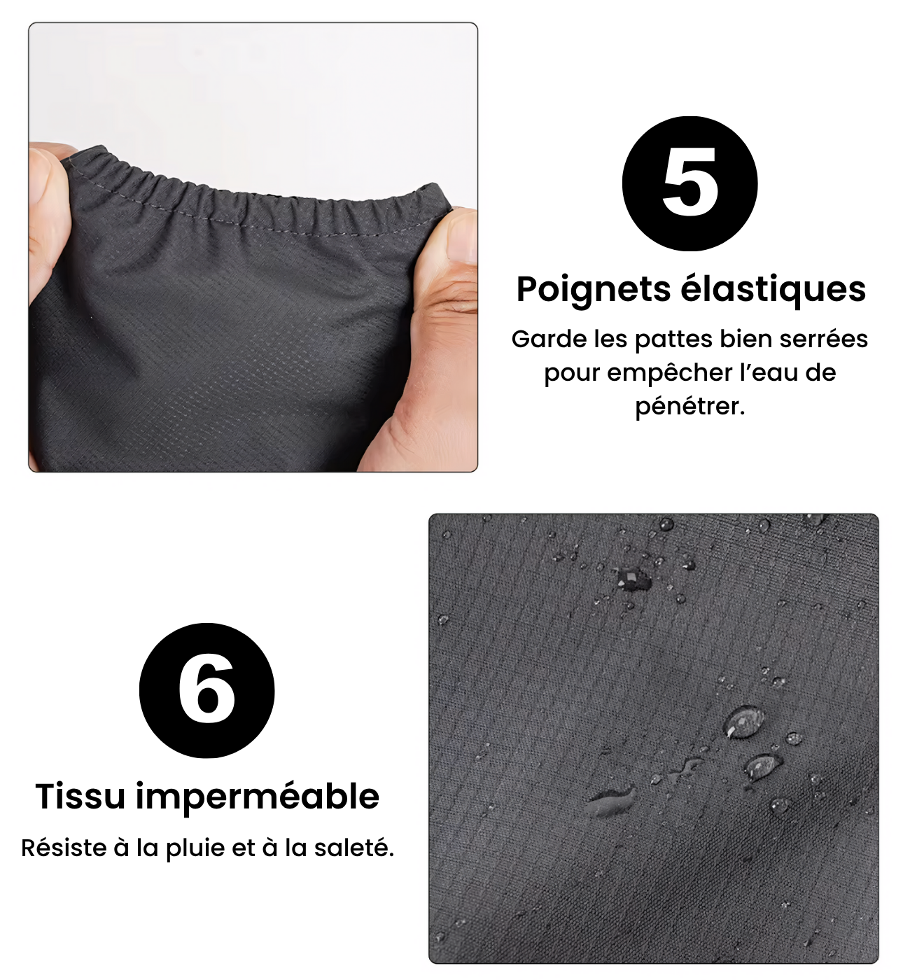 Fini les frissons et les poils trempés ! Offrez à votre petit compagnon une protection totale contre la pluie, le vent et la saleté. Pour des balades joyeuses, peu importe la météo.