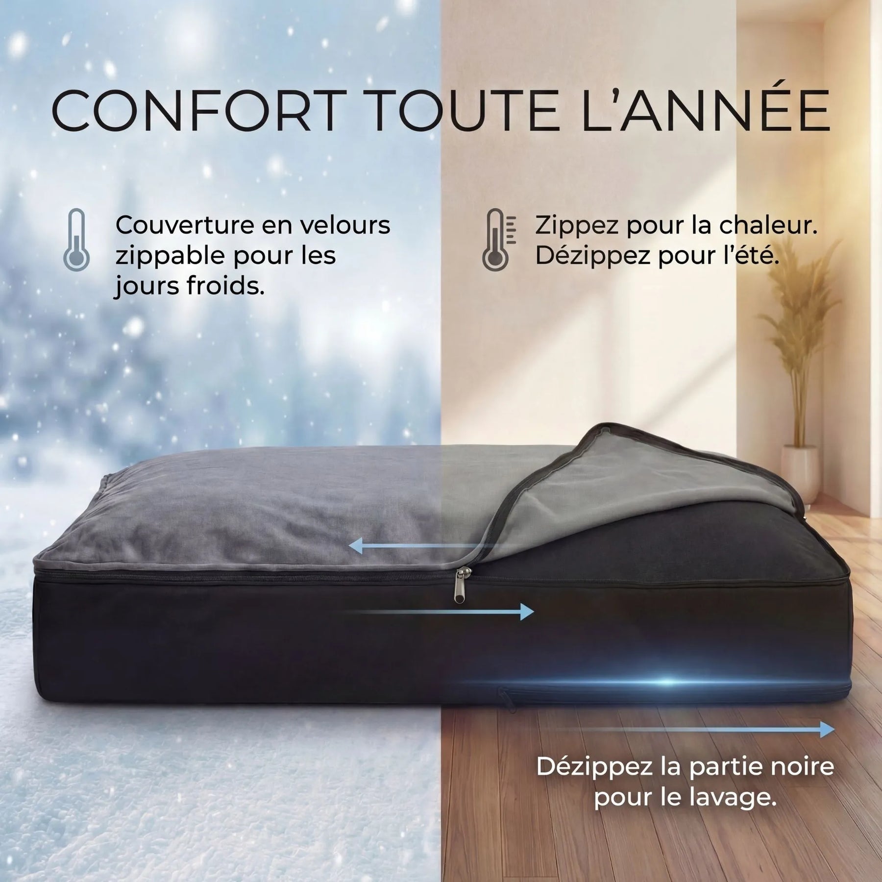 - En Hiver : Gardez la couverture velours pour une chaleur cocooning.