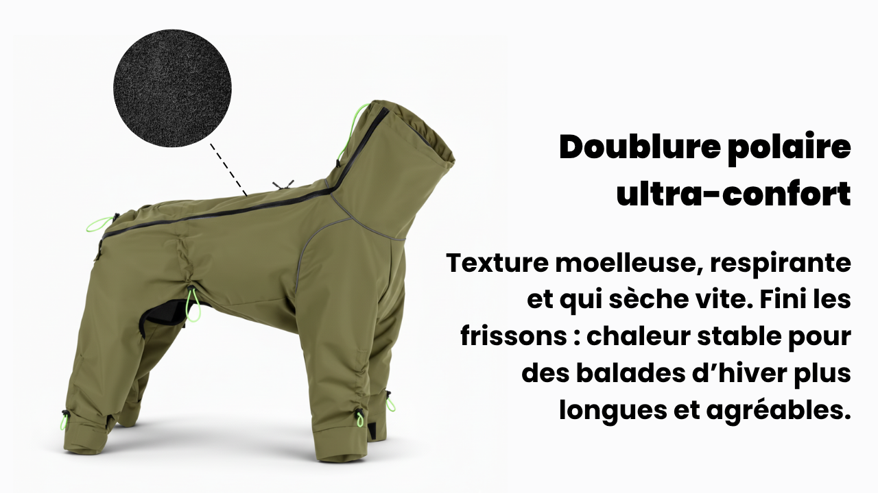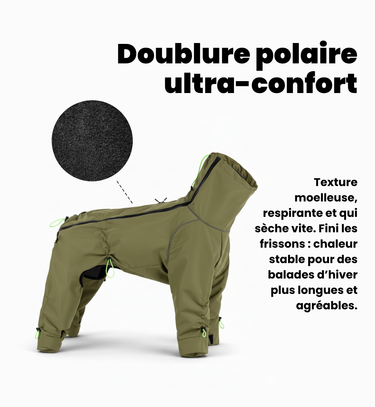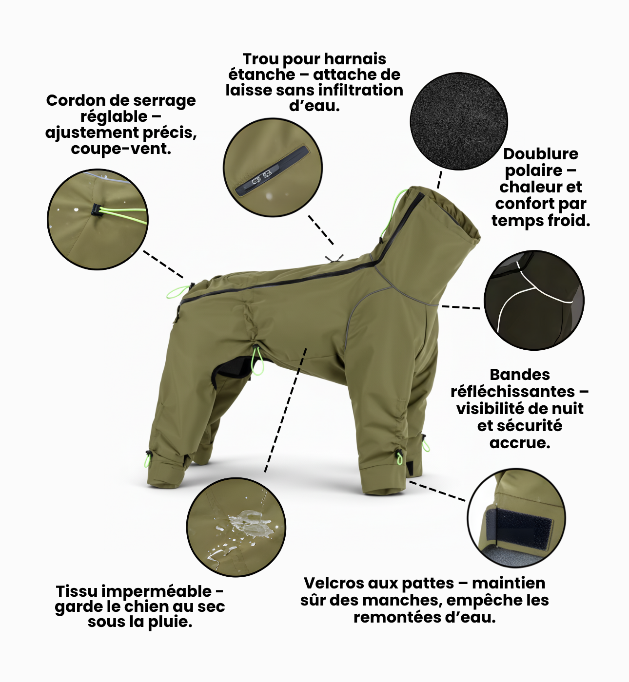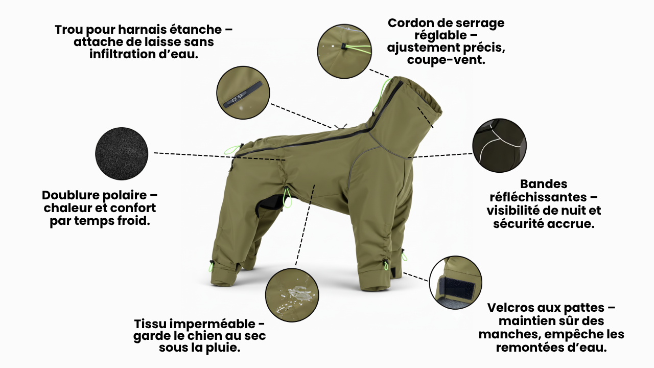 Fini les frissons et les poils trempés ! Offrez à votre compagnon une protection totale contre le froid, la pluie, le vent et la saleté. Pour des balades joyeuses, peu importe la météo.