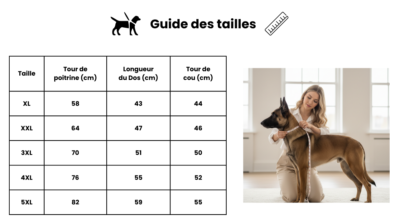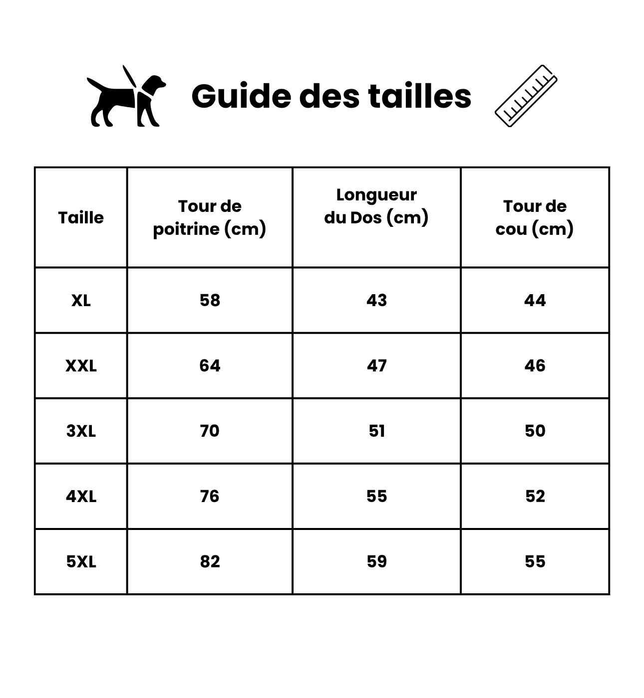 Conseil : si votre chien est entre deux tailles, choisissez la taille au-dessus.